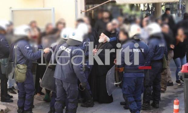 Λίγά λεπτά αργότερα από τον χώρο του Ιερού Μητροπολιτικού Ναού βγήκε ο Αρχιεπίσκοπος Κρήτης που κατευθύνθηκε προς τους συγκεντρωμένους αντιεξουαστες προκειμένου να τους εξηγήσει ότι η εκκλησία δεν έχει θέση σε τέτοιου είδους αντιπαραθέσεις.