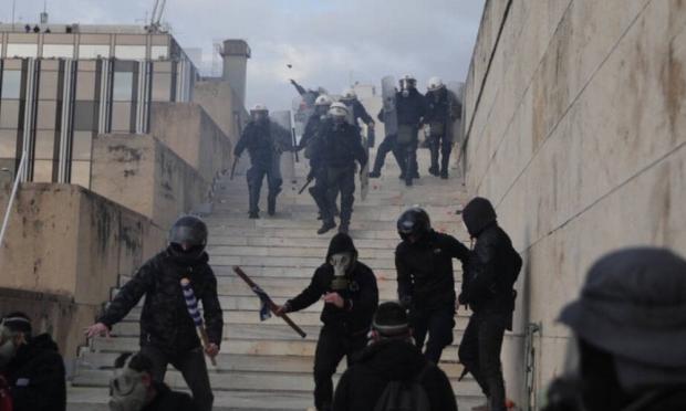 Η αγριότητα με την οποία οι κουκουλοφόροι χτυπούν τον αστυνομικό είναι πρωτοφανής.