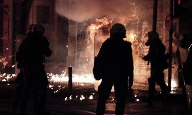 Κρατούν στα χέρια τους πάνω από 10 βόμβες μολότοφ και τις εκτοξεύουν κατά αστυνομικών μίας διμοιρίας της Υποδιεύθυνσης Μέτρων Επιτήρησης Τάξης, που βρίσκεται στατικά στο σημείο. Οι τελευταίοι απαντούν στους αντιεξουσιαστές με χειροβομβίδες κρότου- λάμψης και δακρυγόνα, με τους κουκουλοφόρους να πετούν φέιγ βολάν στη μνήμη του Αλέξανδρου Γρηγορόπουλου, ο οποίος δολοφονήθηκε πριν από δέκα χρόνια από τον αστυνομικό Κορκονέα, και εξαφανίζονται. Οι αστυνομικοί που ήταν εκεί τους είδαν να τρέχουν προς την Πανεπιστημιούπολη, εκεί όπου εξαφανίστηκαν σαν… σκιές εκμεταλλευόμενοι το πανεπιστημιακό άσυλο.