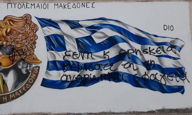 Φίλες και φίλοι αυτός είναι ο πολιτισμός τους, σκοπός τους είναι να «μαυρίσουν» και να σβήσουν καθετί που θυμίζει Ελλάδα, να «μαυρίσουν» καθετί που θυμίζει ορθοδοξία. Εμείς το γκράφιτι θα το αφήσουμε έτσι για να θυμίζει σ όλο τον κόσμο ποσο μαύρες είναι οι ψυχές σας απέναντι στον Ελληνισμό. Και μπορεί όντως να καταφέρατε να » μαύρισετε» το γκράφιτι αλλά δεν θα καταφέρετε ποτέ να μας μαύρισετε όλους εμάς που θα φωνάζουμε για πάντα πως η ΜΑΚΕΔΟΝΙΑ ΕΙΝΑΙ ΜΟΝΟ ΜΙΑ ΚΑΙ ΕΙΝΑΙ ΕΛΛΗΝΙΚΗ Και πολύ σύντομα θα έρθει η ώρα που όλοι εμείς θα σας μαυρισουμε μαζικά στην κάλπη!!