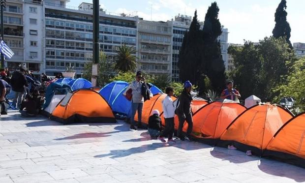 Στο Σύνταγμα και συγκεκριμένα στην πάνω πλατεία, απέναντι από τη Βουλή, κατασκηνώνουν πρόσφυγες και μετανάστες, με καταγωγή από το Ιράκ και το Αφγανιστάν, που μέχρι πρότινος διέμεναν στην κατάληψη κτιρίου που εκκενώθηκε στα Εξάρχεια.