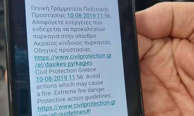 Γενική γραμματεία πολιτικής προστασίας 10-08-2019 11:56. Αποφύγετε ενέργειες που ενδέχεται να προκαλέσουν πυρκαγιά στην ύπαιθρο. Ακραίος κίνδυνος πυρκαγιάς. Οδηγίες προστασίας civilprotection.gr. Το μήνυμα στέλνεται και στην αγγλική γλώσσα