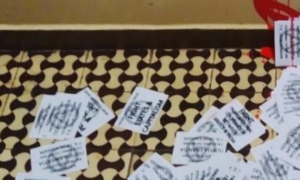 Στα τρικάκια αναγράφονταν μηνύματα κατά της 84ης ΔΕΘ. Υπενθυμίζεται ότι η τιμώμενη χώρα της εφετινής ΔΕΘ είναι η Ινδία. Σύμφωνα με την Αστυνομία η ενέργεια προέρχεται από άτομα που ανήκουν στον αντιεξουσιαστικό χώρο.