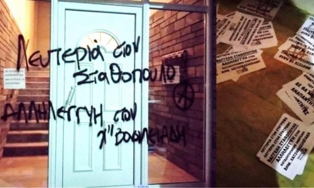 Οι αναρχικοί πέταξαν τρικάκια και έγραψαν συνθήματα στην είσοδο του κτηρίου και στη συνέχεια τράπηκαν σε φυγή, όπως γράφει το voria.gr.