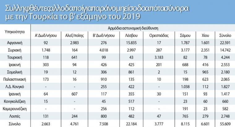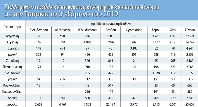 Σύμφωνα με τα στοιχεία, από τον Ιούλιο έως τον Δεκέμβριο του 2019, δηλαδή το δεύτερο εξάμηνο του προηγούμενου έτους, οι μετανάστες και οι πρόσφυγες που εισήλθαν παράνομα στη χώρα μας και συνελήφθησαν για να οδηγηθούν σε δομές φτάνουν στον εξωφρενικό αριθμό των 55.609.