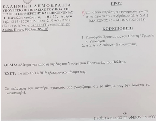 Τονίζουμε δε ότι μας προκαλεί προβληματισμό το γεγονός ότι η απάντηση υπογράφεται από τον προϊστάμενο του γραφείου τύπου του υπουργείου Προστασίας του Πολίτη. Η τακτική αυτή δηλώνει ότι η πολιτική ηγεσία απαξιοί να απαντήσει επιχειρησιακά, ενώ εκ του παραλλήλου εξασφαλίζεται πως η άρνηση δεν έχει χαρακτήρα εκτελεστής διοικητικής πράξης, προκειμένου να μη μπορεί να προσβληθεί ενώπιον διοικητικού δικαστηρίου ως παράνομη και, συνεπώς, άκυρη.