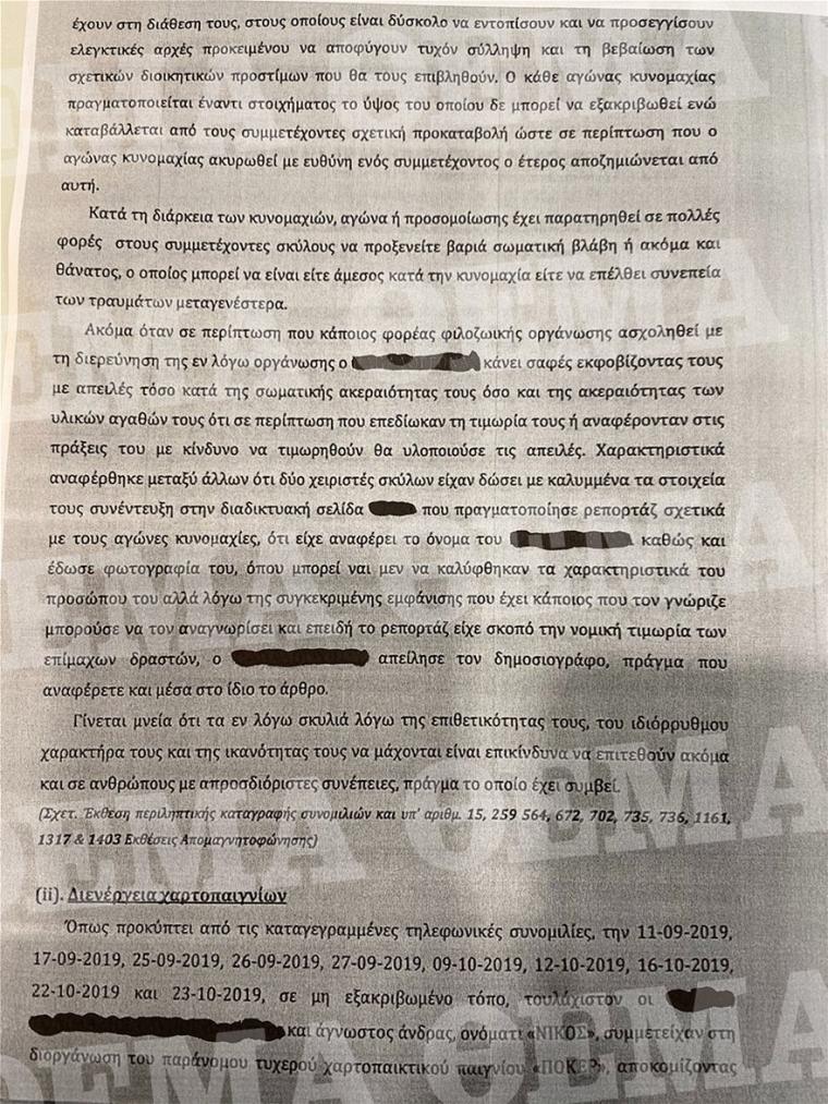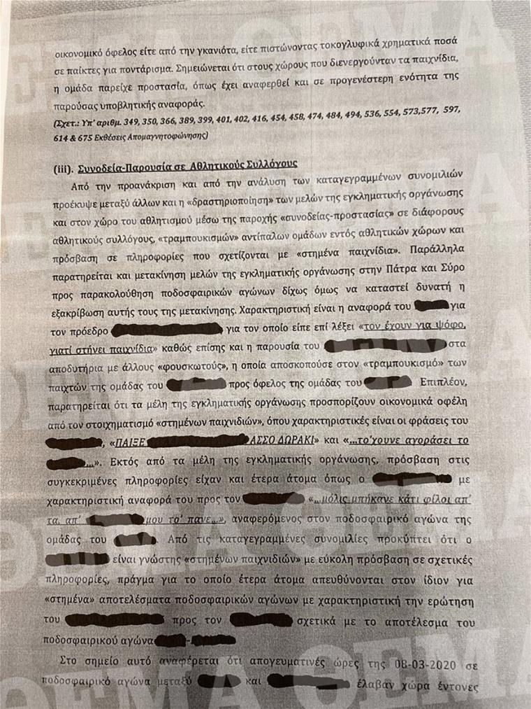 Η συμμορία του Πειραιά, σύμφωνα με το διαβιβαστικό, παρείχε προστασία σε αθλητικούς συλλόγους ενώ από τις τηλεφωνικές υποκλοπές είχαν επαφές και γνώση για τα στημένα ποδοσφαιρικά παιχνίδια του στοιχήματος.