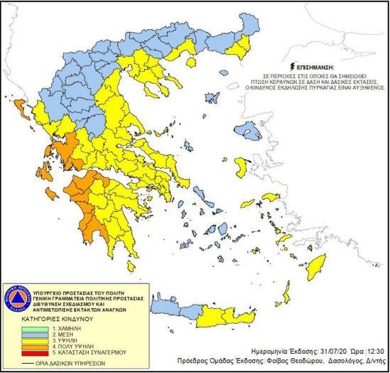 Σύμφωνα με το Χάρτη Πρόβλεψης Κινδύνου Πυρκαγιάς που εκδίδει η Γενική Γραμματεία Πολιτικής Προστασίας του Υπουργείου Προστασίας του Πολίτη (www.civilprotection.gr), για αύριο, Σάββατο 1 Αυγούστου, προβλέπεται πολύ υψηλός κίνδυνος πυρκαγιάς (κατηγορία κινδύνου 4) για τις εξής περιοχές: