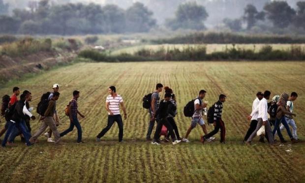 Διακρίνεται μια ομάδα λαθρομεταναστών που περνά μέσα από το χωριό.
