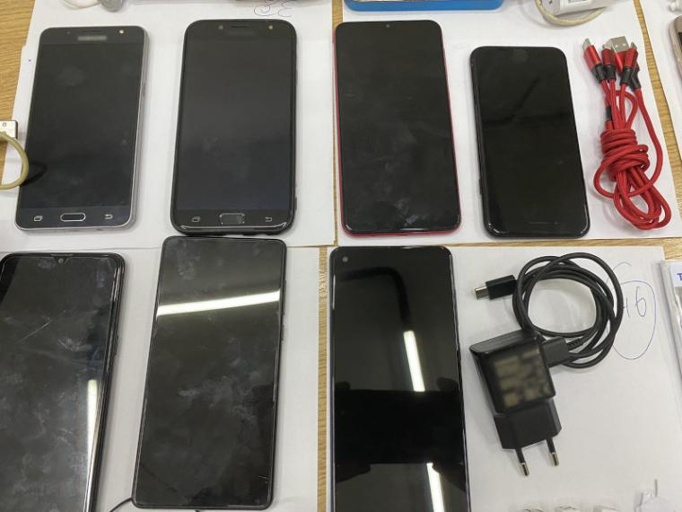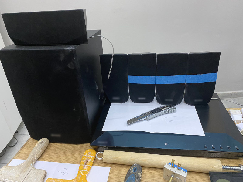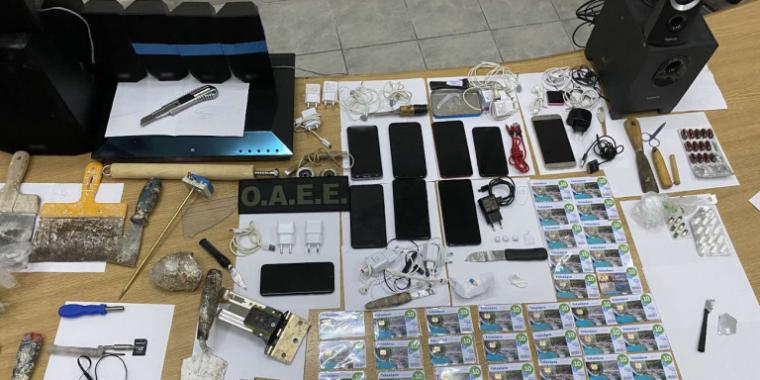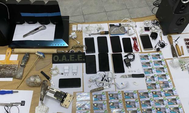 Επτά αυτοσχέδια μαχαίρια, αυτοσχέδιο σουβλί και 2 αυτοσχέδια κατσαβίδια, αυτοσχέδιο ρόπαλο, 3 αυτοσχέδιες συσκευασίες κάνναβης συνολικού βάρους 0,19 γρ, 60 χάπια (ψυχοφάρμακα), χαρτοκόπτης και 2 ψαλιδάκια, 3 μεταλλικά σφαιρίδια, 9 κινητά τηλέφωνα και 10 φορτιστές, 3 USB, 13 hands free, 5 κάρτες sim, 54 τηλεκάρτες, 2 subwoofer, 7 ηχεία, bluray player και συσκευή αναπαραγωγής ήχου mp3, 2 καθρεφτάκια παρακολούθησης, 6 σπάτουλες, μυστρί, μεντεσές, μπουκάλι διαλυτικού, πέτρα, αντίσταση, 3 ζάρια, τμήμα τζαμιού και πλεξιγκλάς.
