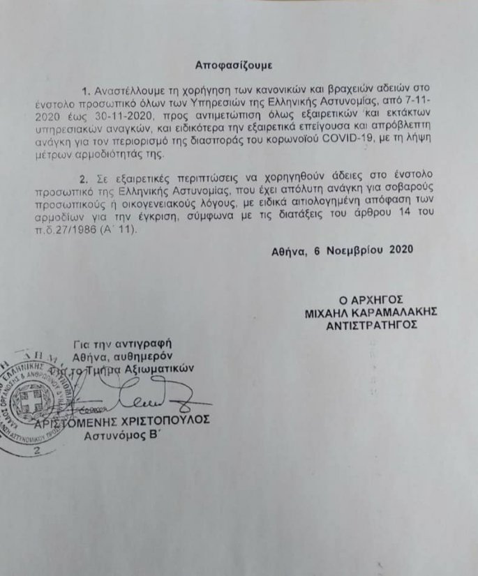 Η απόφαση ελήφθη στο πλαίσιο των έκτακτων μέτρων για την αντιμετώπιση του κορονοϊού. Ο αρχηγός της ΕΛ.ΑΣ. αναφέρει ότι μόνο σε εξαιρετικές περιπτώσεις θα χορηγηθούν άδειες στο ένστολο προσωπικό της ΕΛ.ΑΣ. για σοβαρούς προσωπικούς ή οικογενειακούς λόγους.