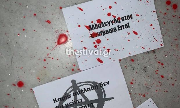 Οι δράστες έριξαν κόκκινη μπογιά στην πόρτα του γραφείου. Τα τρικάκια που πέταξαν είχαν το σήμα της αναρχίας και έγραφαν: «Αλληλεγγύη στον σύντροφο Errol – Καμία απέλαση δεν θα μείνει αναπάντητη».
