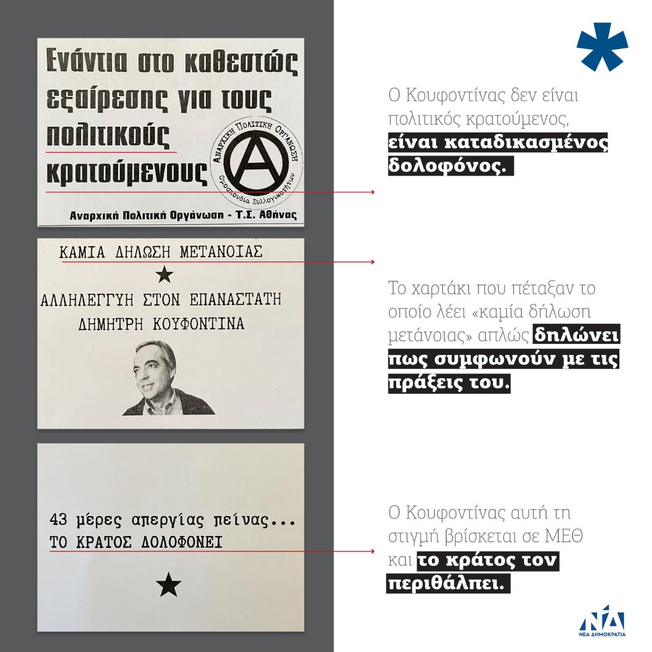 • Όσο για το σλόγκαν πως «το κράτος δολοφονεί» θα θέλαμε να τους ενημερώσουμε πως ο Κουφοντίνας αυτή τη στιγμή βρίσκεται σε μονάδα εντατικής θεραπείας και το κράτος τον περιθάλπει.