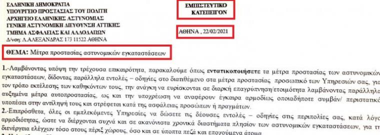 Στο κατεπείγον έγγραφο που είχε συνταχθεί πριν από μία εβδομάδα ζητείτο από τις αστυνομικές υπηρεσίες «λαμβάνοντας υπόψη την τρέχουσα επικαιρότητα όπως εντατικοποίησετε τα μέτρα προστασίας των αστυνομικών εγκαταστάσεων. Δίνοντας παράλληλα εντολές κι οδηγίες στο διατιθέμενο στα μέτρα προστασίας προσωπικό των υπηρεσιών σας για τον τρόπο εκτέλεσης των καθηκόντων τους, την ανάγκη να ευρίσκονται σε διαρκή επαγρύπνηση και ετοιμότητα. Λαμβάνοντας παράλληλα αυξημένα μέτρα αυτοπροστασίας. Επιπλέον έχουν την υποχρέωση να αναφέρουν έγκαιρα αρμοδίως οποιοδήποτε συμβάν περιστατικό υποπέσει στην αντίληψή τους και στρέφεται κατά της ασφάλειας προσώπων ή πραγμάτων».