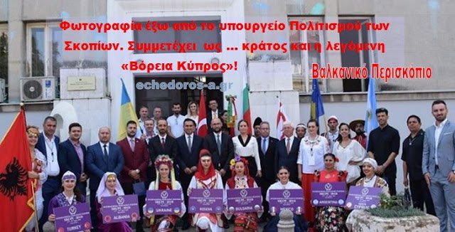 Σε επίσημη φωτογραφία του Υπουργείου Πολιτισμού των Σκοπίων, που δημοσιεύθηκε μετά την παραλαβή μέρους των διοργανωτών του Διεθνούς Φεστιβάλ Φολκλόρ «Σκούπι 2018», υπάρχουν δύο χαρακτηριστικά στοιχεία.