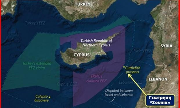 Παρατηρούμε ότι η θέση της Γεώτρησης «Σουπιά» (Cuttlefish) -εκεί όπου η ιταλική εταιρεία ENI προσπάθησε να τοποθετήσει ανεπιτυχώς το γεωτρύπανο Saipem 12000- γεωγραφικά βρίσκεται πολύ κοντά στα θαλάσσια όρια Λιβάνου-Κύπρου & εμφανώς προσδιορίζεται έξω από τα όρια της υφαλοκρηπίδας (με χρώμα μωβ) που διεκδικεί η τουρκοκυπριακή πλευρά (Εικ.1).