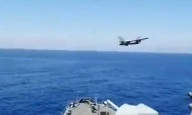 Το τουρκικό μαχητικό πέταξε κοντά στο γεωτρύπανο αλλά και τη φρεγάτα που βρίσκεται σε κοντινή απόσταση για να το προστατεύει.