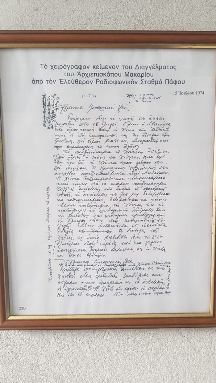 Το χειρόγραφο διάγγελμα του Αρχιεπισκόπου Μακαρίου φυλάσσεται στις ιστορικές εγκαταστάσεις του εργαστηρίου του πατέρα της ελεύθερης Ραδιοφωνίας στην Πάφο Νίκου Νικολαΐδη.