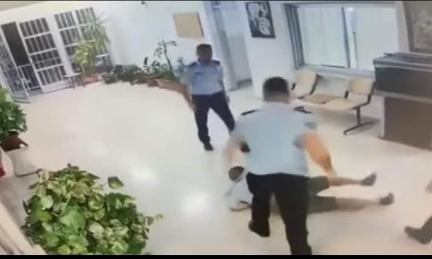 Στο βίντεο εμφανίζεται ένας αστυνομικός να σέρνει έναν άνδρα σε έναν δωμάτιο όπου τον χτυπάει κατ’ επανάληψη με κλωτσιές στο σώμα και στο κεφάλι.