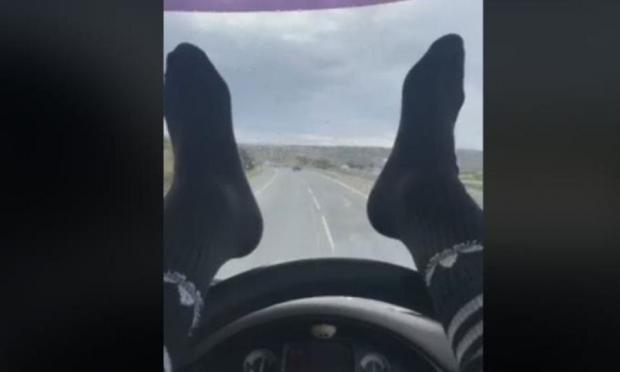 Στο κλιπ που προκαλεί σοκ, o ασυνείδητος οδηγός φαίνεται να κινείται με το όχημά του σε αυτοκινητόδρομο και να τραβάει βίντεο ενώ συγκρατεί το τιμόνι μόνο με τα πόδια του.
