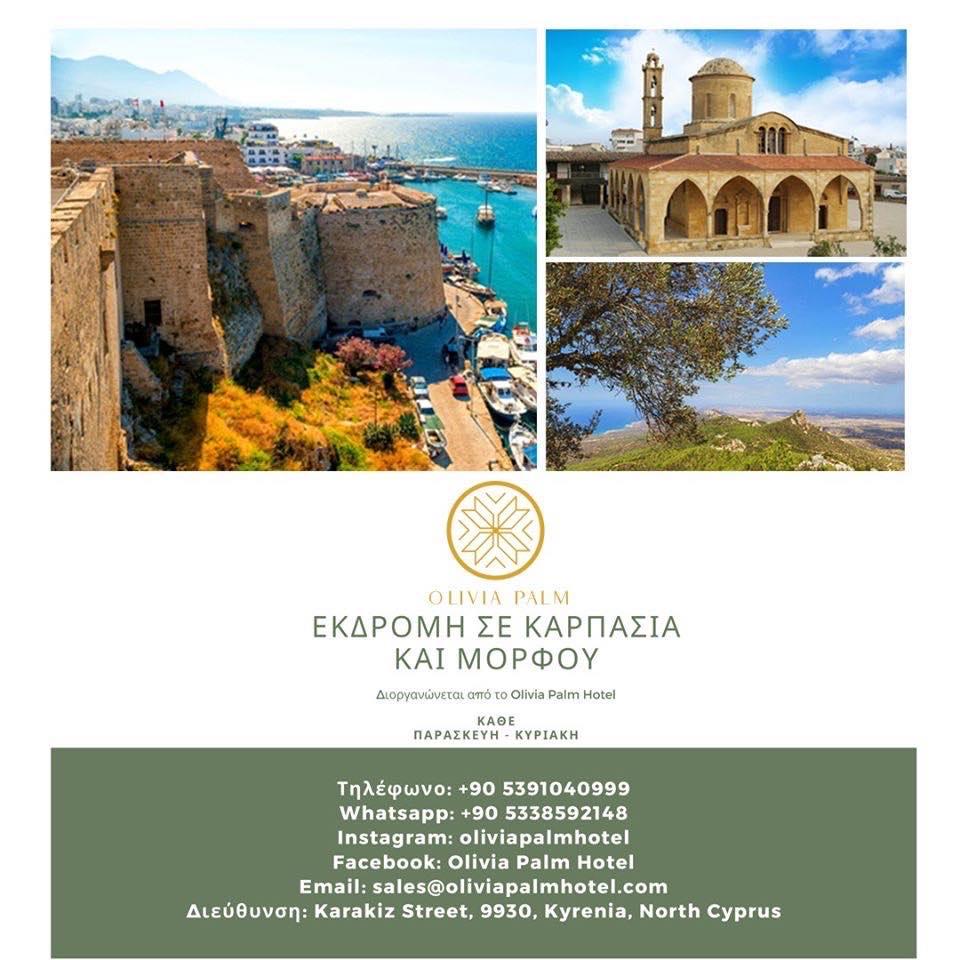 Τουρίστες στην πατρίδα τους; Κι όμως, οι αρμόδιοι του «Olivia Palm Hotel», που προφανώς χτίστηκε παράνομα στην κατεχόμενη Κερύνεια, διοργανώνει εκδρομές, τις οποίες διαφημίζει μάλιστα και στα ελληνικά.