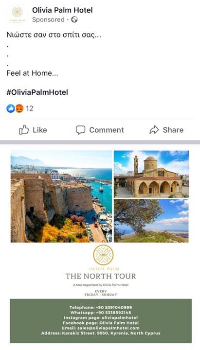 Το θράσος των ιδιοκτητών του ξενοδοχείου «Olivia Palm», που… ταξιδεύει τους Ελληνοκύπριους πρόσφυγες στον Απόστολο Ανδρέα και στο μοναστήρι του Αγίου Μάμα στη Μόρφου, φαίνεται και από την εισαγωγική φράση της διαφήμισης: «Νιώστε σαν στο σπίτι σας».