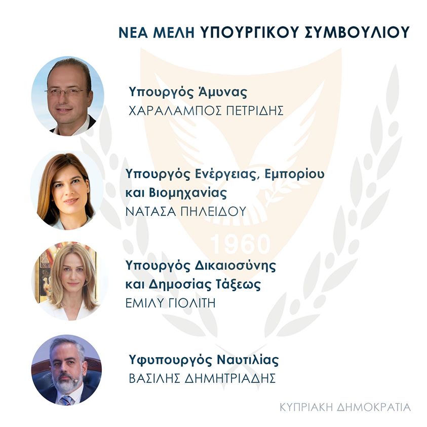 Ο Πρόεδρος αποφάσισε να διορίσει στη θέση του Υπουργού Άμυνας τον μέχρι σήμερα δήμαρχο Αγλαντζιάς, Χαράλαμπο Πετρίδη. Διόρισε, επίσης, στη θέση του Υπουργού Εμπορίου, τη μέχρι πρότινος Υφυπουργό Ναυτιλίας, Νατάσα Πηλείδου και στη θέση του Υπουργού Δικαιοσύνης, τη νομικό Έμιλυ Γιολίτη. Αντικαταστάτης της κ. Πηλείδου στο Υφυπουργείο Ναυτιλίας, διορίστηκε ο κύριος Βασίλης Δημητριάδης ο οποίος είναι Εθνικός Εμπειρογνώμονας για θέματα ναυτιλιακής πολιτικής στη Γενική Διεύθυνση Μεταφορών και Κινητικότητας της Ευρωπαϊκής Επιτροπής.