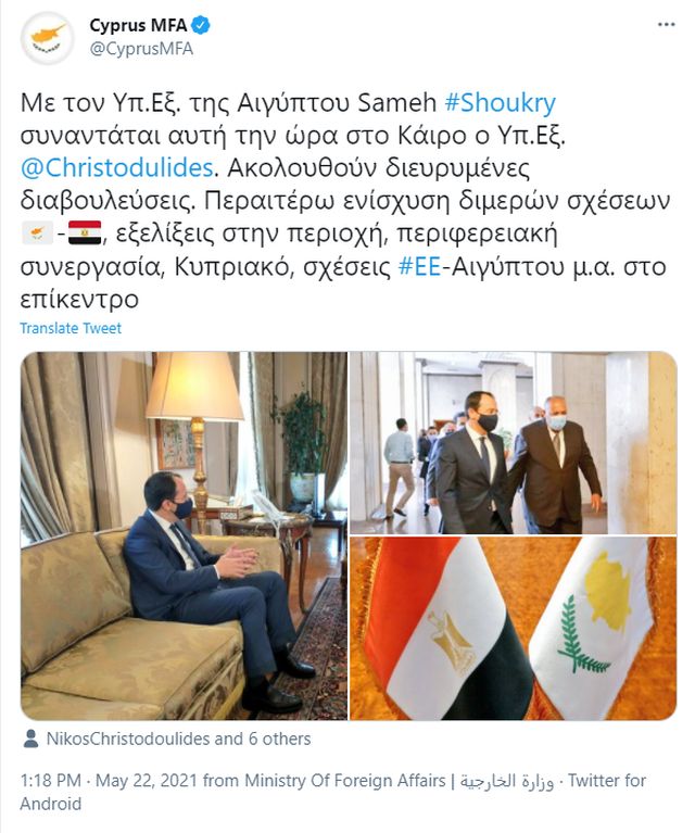 «Η συνεργασία Κύπρου και Αιγύπτου γίνεται όλο και πιο δυνατή, βασισμένη στο σεβασμό του διεθνούς δικαίου και μίας θετικής ατζέντας για την περιοχή», έγραψε σε Twitter ο εκπρόσωπος του υπουργείου Εξωτερικών, Δημήτρης Σαμουήλ.
