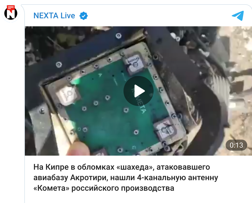 Σύμφωνα με οπτικό υλικό και ρεπορτάζ που έφερε στο φως το κανάλι Nexta, στα συντρίμμια του ιρανικού drone Shahed, το οποίο επιτέθηκε στη βάση της Κύπρου τη Δευτέρα, εντοπίστηκε μια τετρακάναλη κεραία ρωσικής κατασκευής με την ονομασία Kometa.