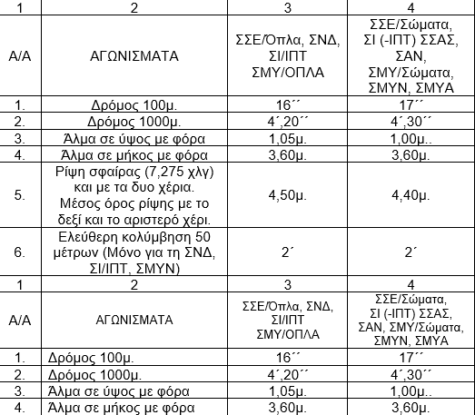 Στον πίνακα που ακολουθεί φαίνονται τα αγωνίσματα και τα κατώτερα όρια επίδοσης κατά αγώνισμα και Σχολή, που πρέπει να πετύχει ο/η υποψήφιος/α (ανεξαρτήτως φύλου) για να κριθεί κατάλληλος/η.