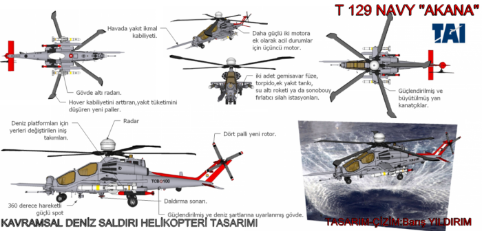 Γι αυτό και ετοιμάζεται ήδη ναυτική έκδοση του επιθετικού ελικοπτέρου T- 129 ΑΤΑΚ, το οποίο θα είναι αποτέλεσμα προσπάθειας της τουρκικής αμυντικής βιομηχανίας να ανταποκριθεί στις απαιτήσεις των τουρκικών ενόπλων δυνάμεων, για ένα ελικόπτερο επιθετικό σε διαμόρφωση ναυτικού αγώνα ειδικά στο Αιγαίο .