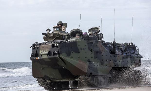 Πεζοναύτες ελίσσονται με τα αμφίβια οχήματα AAV-P7 / A1 Assault από την ακτή στο νερό, στην παραλία της Onslow, στο Camp Lejeune.
