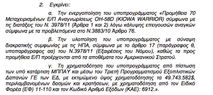 Σχεδόν 50 εκατομμύρια δολάρια θα μας κοστίσουν τελικά τα παροπλισμένα από τις ΗΠΑ ελικόπτερα KIOWA. Η υπόθεση τυπικά έκλεισε στις 9 Ιανουαρίου, με τις υπογραφές που μπήκαν. Ουσιαστικά είχε κλείσει πολύ νωρίτερα. Οι Αμερικανοί που είχαν θέσει ως χρονικό όριο την 20η Δεκεμβρίου ,προφανώς και δεν είχαν κανένα απολύτως θέμα να περιμένουν την ολοκλήρωση της τυπικής διαδικασίας για να δώσουν τα ελικόπτερα που τα ΄χαν προς καταστροφή και να εισπράξουν και κοντά στα 50 εκατομμύρια.
