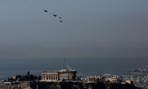 Αεροσκάφη της Πολεμικής Αεροπορίας (δύο F-16, ένα Mirage 2000 και δύο F-4) πέταξαν λίγο μετά τις 12.00 το μεσημέρι της Δευτέρας πάνω από το κέντρο της Αθήνας.