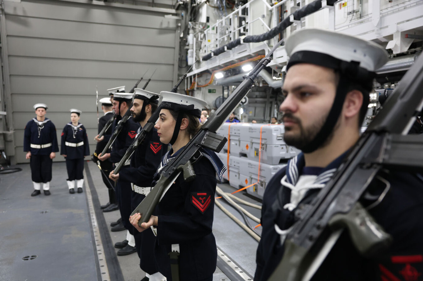 Η εικόνα έχει τελετουργικό χαρακτήρα και ταυτόχρονα είναι βαθιά ναυτική. Δείχνει ότι η νέα φρεγάτα εντάσσεται από την πρώτη στιγμή σε ροή επιχειρησιακής λειτουργίας. Όχι ως ένα πλοίο που απλώς καταπλέει. Αλλά ως μονάδα που προστίθεται στο δόγμα συνοδείας, στην κίνηση σχηματισμού και στη λογική κοινής τακτικής εικόνας.