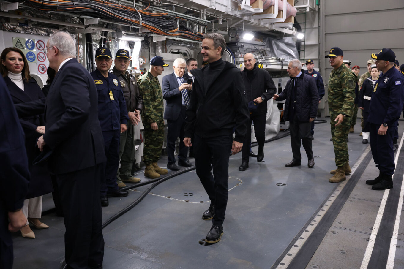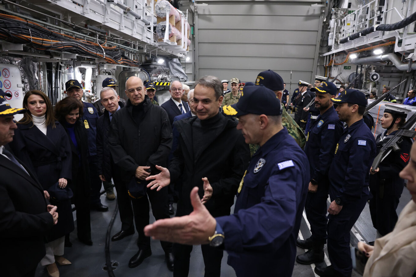 Ο Νίκος Δένδιας ξεναγήθηκε στη φρεγάτα Κίμων από τον Κυβερνήτη του πλοίου, αντιπλοίαρχο Ιωάννη Καζιάνη.