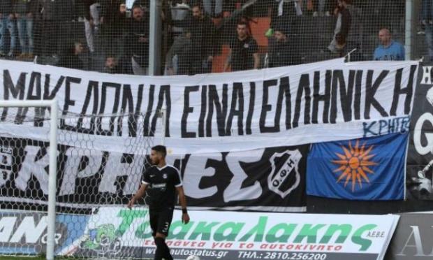 Οι οπαδοί του ΟΦΗ κρέμασαν πανό για την Μακεδονία και παράλληλα φώναζαν συνθήματα με αποτέλεσμα να χειροκροτήσει όλο το γήπεδο.