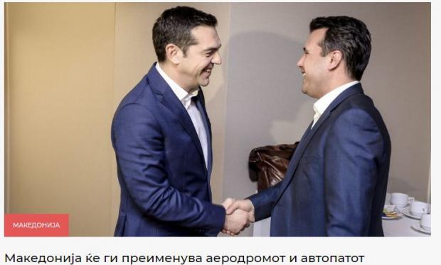 Το σκοπιανό τηλεοπτικό δίκτυο «TV Telma», εστιάζει στην απόφαση, «ως ένδειξη καλής πίστης», όπως αναφέρει της πλευράς του Ζόραν Ζάεφ να μετονομάσει το αεροδρόμιο των Σκοπίων, από «Μέγα Αλέξανδρος» σε «Κίρο Γκλιγκόροφ» και ο κεντρικός αυτοκινητόδρομος σε «Φιλίας».