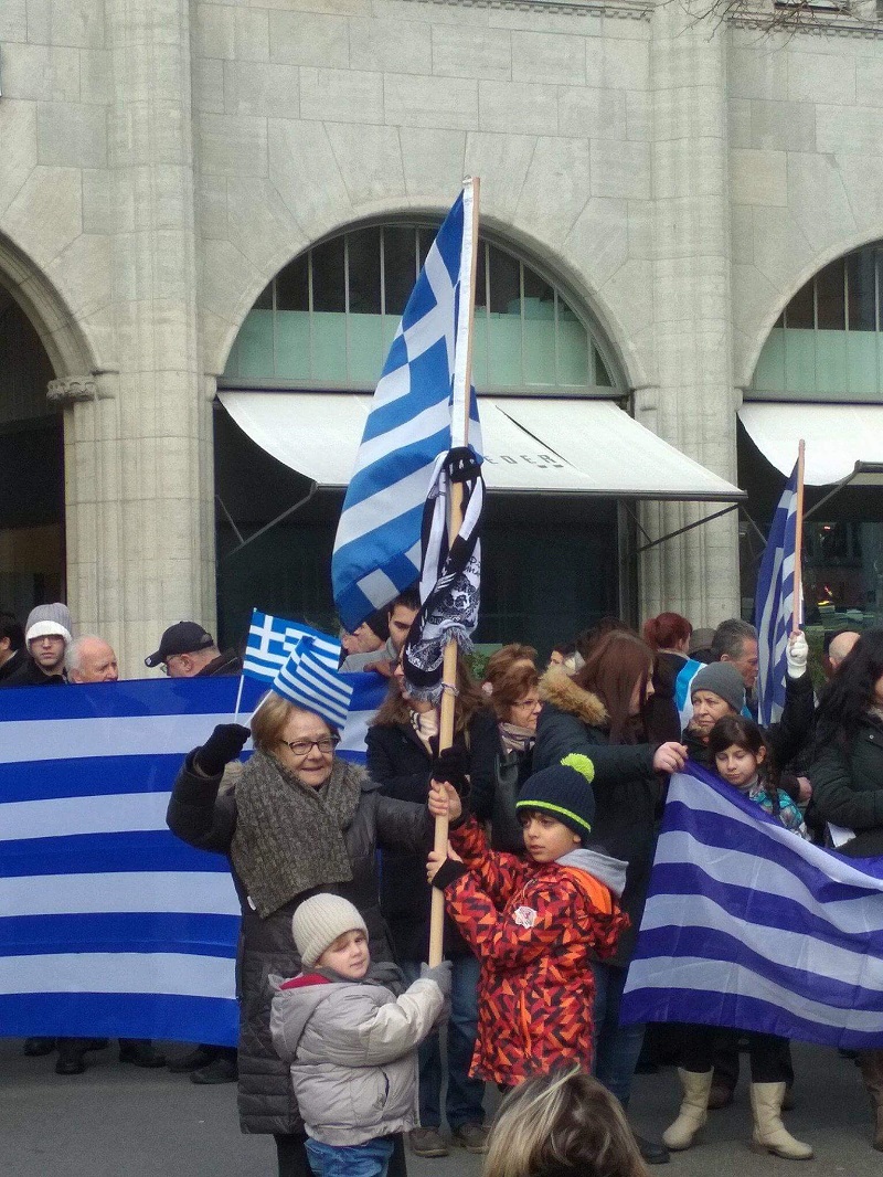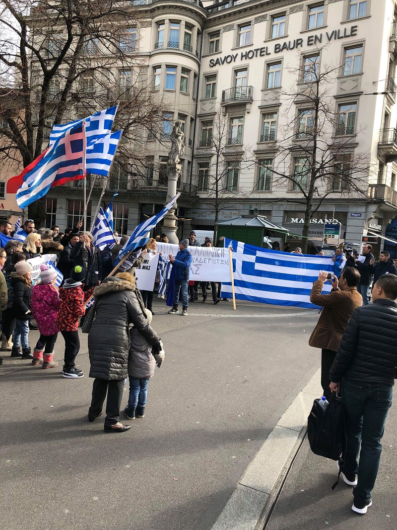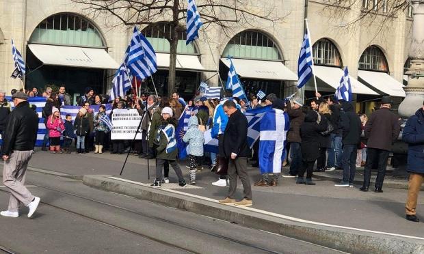 Κρατώντας στα χέρια ελληνικές σημαίες περίπου 200 Έλληνες, όλων των ηλικιών, που ζουν μόνιμα στην Ελβετία συγκεντρώθηκαν σήμερα στο κέντρο της Ζυρίχης προκειμένου να εκφράσουν την αντίθεση τους στην χρήση του όρου Μακεδονία από την ΠΓΔΜ.