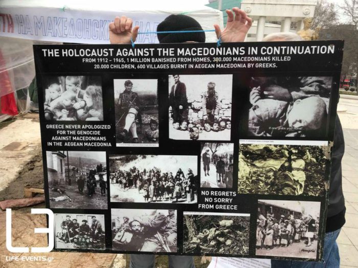 «Οι Ελληνες έδιωξαν από τις οικίες τους 1.000.000 άτομα, 300.000 «Μακεδόνες» δολοφονήθηκαν εκ των οποίων 20.000 παιδιά, 600 χωριά κάηκαν από το 1912 έως το 1965″ αναφέρει σχετικό πλακάτ με ασπρόμαυρες φωτογραφίες νεκρών. Από τα μεγάφωνα ακούγονται διάφορα πατριωτικά τραγούδια για την «Μακεδονία του Αιγαίου».