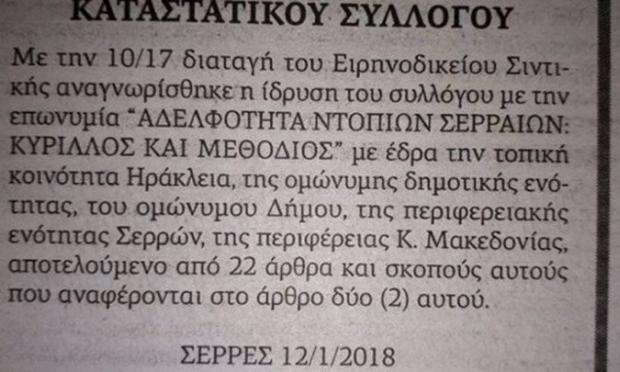 Στις 12 Ιανουαρίου 2018 δημοσιεύθηκε σε τοπική εφημερίδα των Σερρών η ίδρυση νέου Συλλόγου με την επωνυμία «Αδελφότητα Ντόπιων Σερραίων ΚΥΡΙΛΛΟΣ ΚΑΙ ΜΕΘΟΔΙΟΣ» με έδρα την Ηράκλεια Σερρών. Μετά από μελέτη των σκοπών και των μέσων (άρθρο 2 & 3 του καταστατικού) του νεοϊδρυθέντος Συλλόγου διαπιστώθηκε η διάθεση για «προσφορά» σε ποικίλα πεδία που ξεκινά από τις συνήθεις δράσεις ενός κοινού πολιτιστικού συλλόγου (ίδρυση βιβλιοθήκης, ιματιοθήκης κτλ) και φτάνει σε ασυνήθιστες δράσεις όπως η «καταγραφή των κόκκινων δανείων προς τράπεζες των συμπατριωτών μας και υλικο-ηθική συμπαράστασή τους» και «φροντίδα και περίθαλψη τυχόν προσφύγων/μεταναστών».