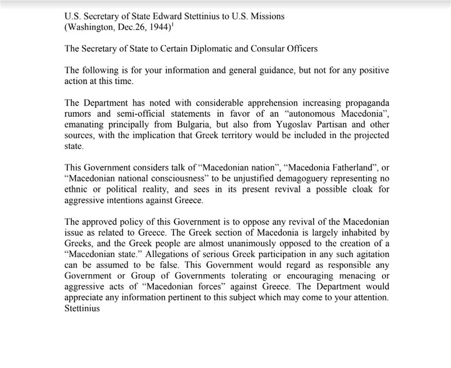 «Τον Δεκέμβριο του 1944 τηλεγράφημα του State Department προς αμερικανικές Αρχές, με υπογραφή του τότε αμερικανού Υπουργού Εξωτερικών Stettinius, έγραφε, μεταξύ άλλων, ότι: «Η (αμερικανική) Κυβέρνηση θεωρεί ότι αναφορές του τύπου μακεδονικό "έθνος", μακεδονική "Μητέρα Πατρίδα" ή μακεδονική "εθνική συνείδηση" αποτελούν αδικαιολόγητη δημαγωγία που δεν αντικατοπτρίζει καμία πολιτική πραγματικότητα και βλέπει σε αυτές την αναγέννηση ενός πιθανού μανδύα που θα υποκρύπτει επιθετικές βλέψεις εναντίον της Ελλάδας».