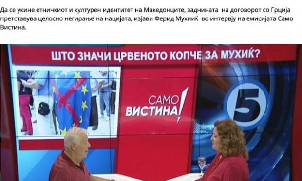 Με την κατάργηση της εθνοτικής και πολιτιστικής ταυτότητας των ‘Μακεδόνων’, το υπόβαθρο της συμφωνίας με την Ελλάδα είναι μία πλήρης άρνηση του έθνους, δήλωσε ο Φερίντ Μούχιτς σε συνέντευξή του στην εκπομπή «Μόνο Αλήθεια» του καναλιού ‘5’ των Σκοπίων.