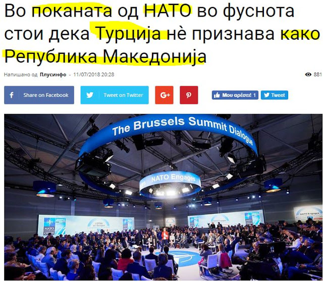 Ο συντονιστής για το ΝΑΤΟ, Στέβο Πενταρόφσκι, στην παρουσία του στην εκπομπή ‘Топ тема’ της τηλεόρασης Τέλμα, αποκάλυψε ότι η πρόσκληση προς τη χώρα μας θα αναγράφει «Πρώην Γιουγκοσλαβική Δημοκρατία της Μακεδονίας», αλλά τόνισε ότι σε υποσημείωση αναφέρεται ότι η Τουρκία δήλωσε ότι αναγνωρίζει τη χώρα ως «Δημοκρατία της Μακεδονίας», γράφει το δημοσίευμα.
