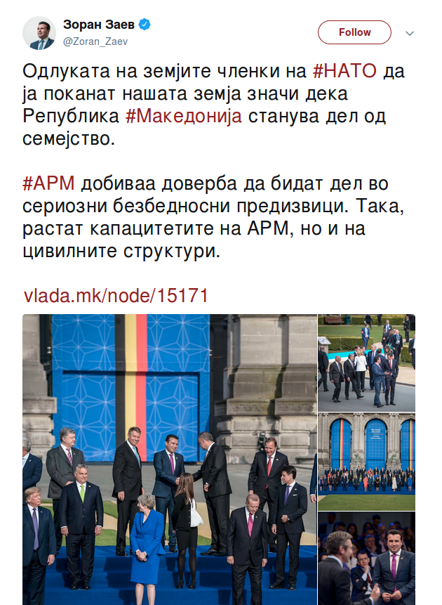 Η Δημοκρατία της Μακεδονίας γίνεται μέρος μιας οικογένειας, έγραψε στο twitter ο Ζάεφ, επισημαίνοντας ότι με τον τρόπο αυτό αυξάνονται οι δυνατότητες ασφάλειας και δομών της χώρας.