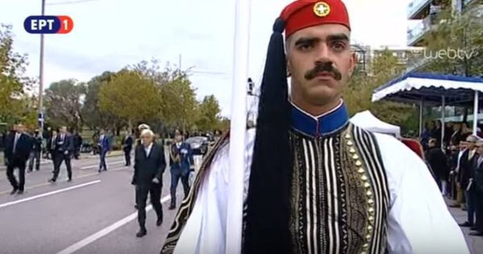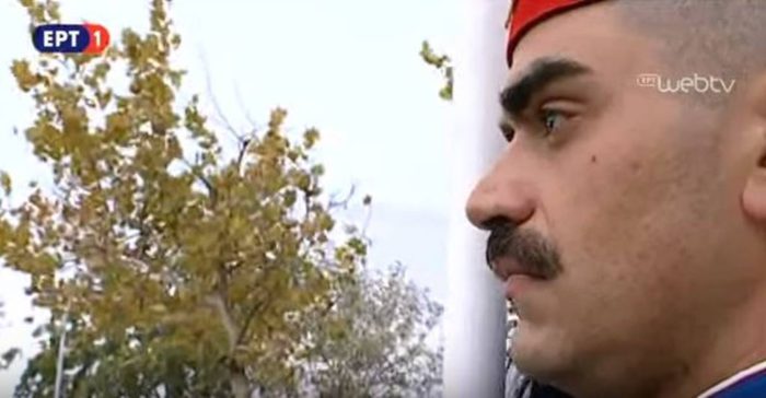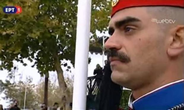 Ο νεαρός Εύζωνας, ο λεγόμενος «δείκτης» της στρατιωτικής παρέλασης στη Θεσσαλονίκη, έκλεψε στην κυριολεξία την παράσταση κατά τη διάρκεια της τηλεοπτικής μετάδοσης.