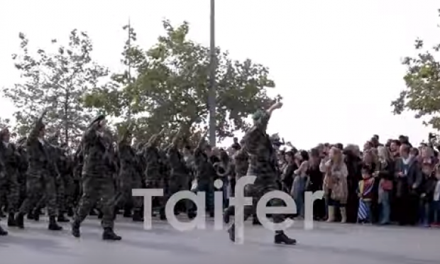 Καταδρομείς της Ε’ μοίρας έπειτα από σταθερό βηματισμό σχεδόν 2 χιλιομέτρων (!), φωνάζουν το «Μακεδονία ξακουστή» στο τέλος της στρατιωτικής παρέλασης της Θεσσαλονίκης και καταχειροκροτούνται από τον κόσμο που παρακολουθεί με δέος.