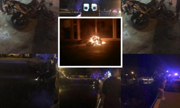Ο οδηγός εκσφενδονίστηκε και το σώμα του βρέθηκε στο νερό ενώ η μοτοσικλέτα σύρθηκε αρκετά μέτρα και άρπαξε φωτιά.