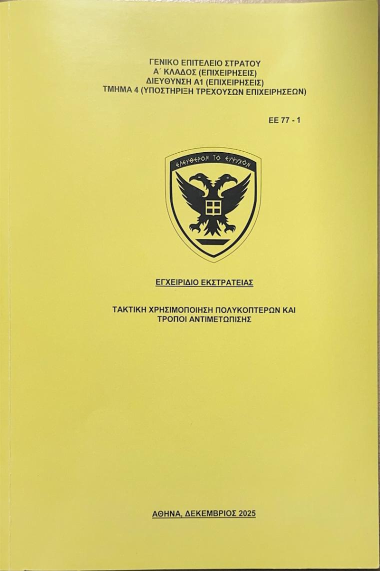 Το Γενικό Επιτελείο Στρατού (ΓΕΣ) προχώρησε, για πρώτη φορά, στη σύνταξη και έκδοση Εγχειριδίου Εκστρατείας που αφορά την τακτική αξιοποίηση πολυκοπτέρων (UAV), καθώς και τους τρόπους αντιμετώπισής τους στο σύγχρονο επιχειρησιακό περιβάλλον, όπως ανακοίνωσε σήμερα, 26 Ιανουαρίου 2026, το υπουργείο Εθνικής Άμυνας.
