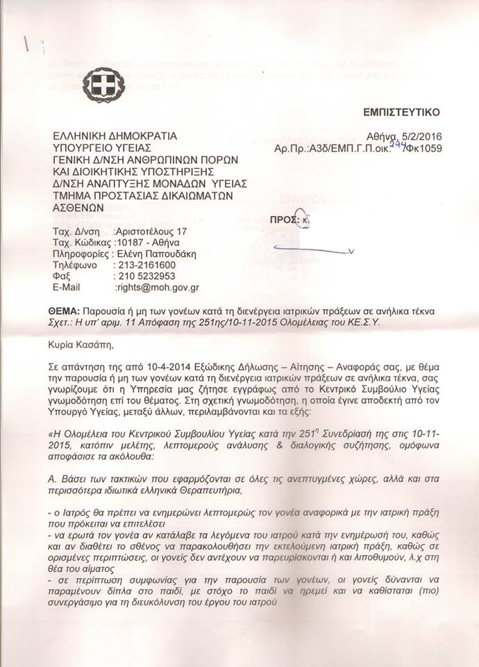 !Προσοχή, το ότι εστάλει αυτή η απόφαση στους γονείς που προσέφυγαν στον ΣτΠ, δεν σημαίνει απαραιτήτως ότι έχει γνωστοποιηθεί ήδη και σε όλο το προσωπικό των νοσοκομείων (διευθυντές, ιατροί, νοσηλευτές).